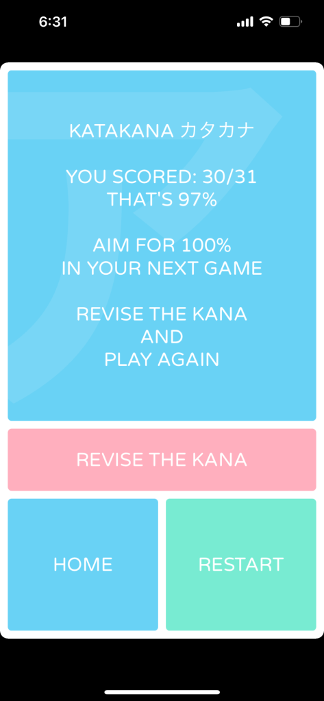La segunda semana empezamos con problemas. Usé la misma app de hiragana que me funcionó muy bien y para katakana no lo fue tanto, no se me pegaban me empecé a frustrar. Acabó la semana y no pude pasar el examen.